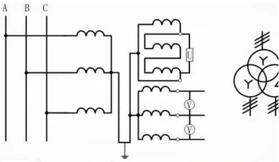 (2)Y,yn接線方法:首要選用三鐵芯柱三相電壓互感器,多用于小電流接地的高壓三相系統(tǒng),二次側(cè)中性接線引出接地,此接線為了避免高壓側(cè)單相接地缺點(diǎn),高壓側(cè)中性點(diǎn)不允許接地,故不能測(cè)量對(duì)地電壓。